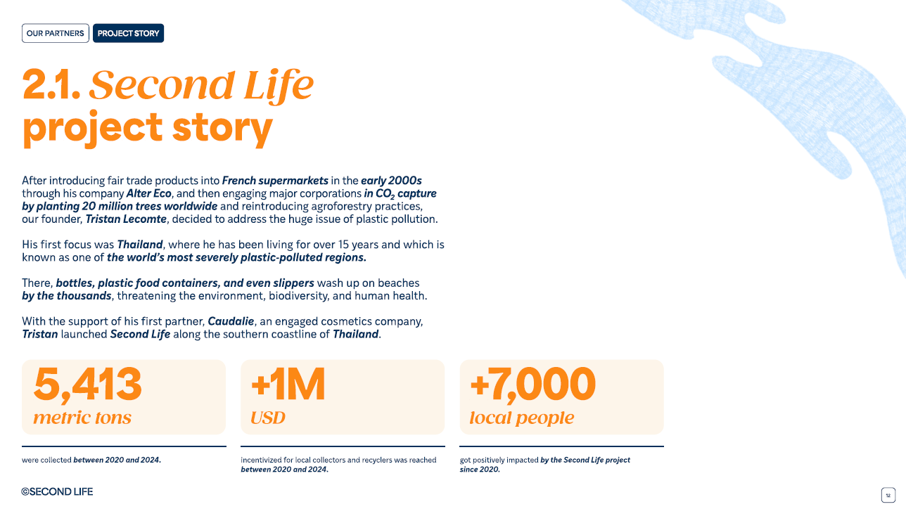 According to the Second Life Annual Report 2024, the organization has collected 5,413 metric tons of plastic waste across the Andaman Coastline of Thailand in the provinces of Krabi, Ranong, Trang, and Phang-Nga since its inception in 2020, with 1,026 metric tons in 2024 alone.
