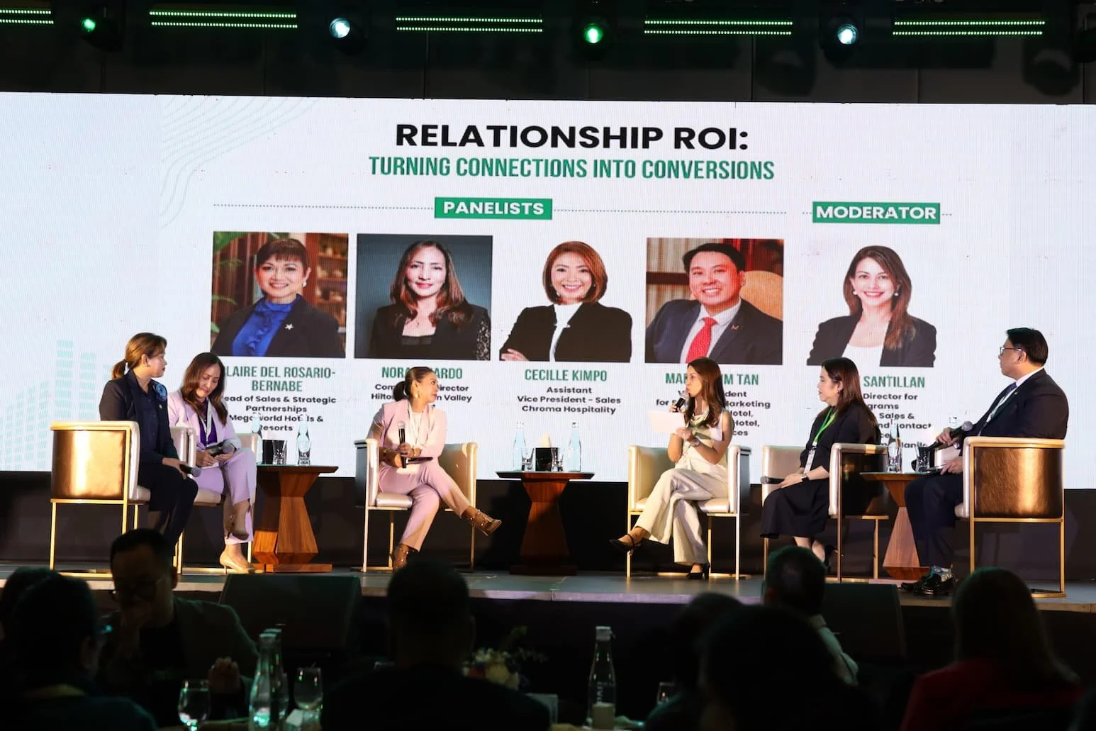 "Relationship ROI: Turning Connections into Conversions", with panelists (from left) Claire Del Rosario-Bernabe, Head of Sales & Strategic Partnerships at Megaworld Hotels & Resorts; Nora Fajardo, Commercial Director at Hilton Clark Sun Valley Resort; Cecille Kimpo, Assistant Vice President – Sales at Chroma Hospitality; moderator Jenny Santillan, HSMA Director for Programs | Director, Sales & Marketing and Contact Services at City of Dreams Manila; panelists Denise Olegario, Cluster Director of Sales & Distribution at The Ascott Limited; and Marvin Kim Tan, Vice President for Sales & Marketing at Manila Hotel